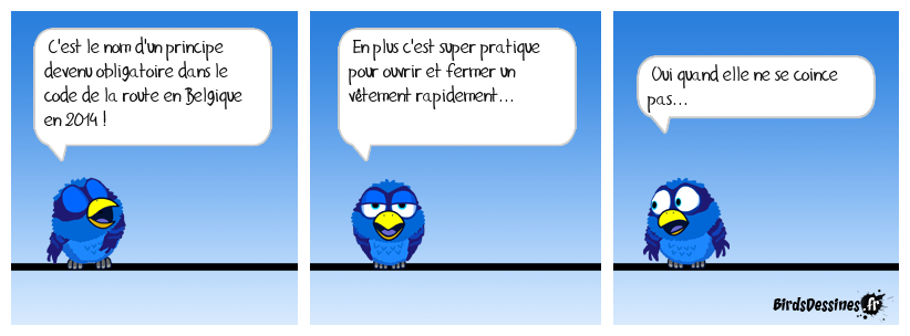 Case 1:Bird 1: C'est le nom d'un principe devenu obligatoire dans le code de la route en Belgique en 2014 ! | Case 2: Bird 1: En plus c'est super pratique pour ouvrir et fermer un vêtement rapidement... | Case 3: Bird 1: Oui quand elle ne se coince pas...