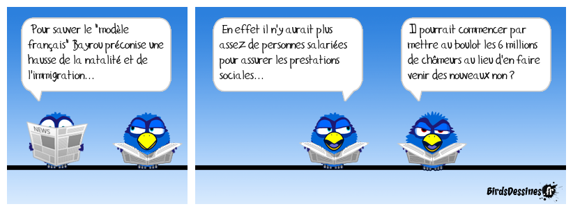 Case 1:Bird 1: Pour sauver le "modèle français" Bayrou préconise une hausse de la natalité et de l'immigration... | Case 2: Bird 1: En effet il n'y aurait plus assez de personnes salariées pour assurer les prestations sociales... | Case 3: Bird 1: Il pourrait commencer par mettre au boulot les 6 millions de chômeurs au lieu d'en faire venir des nouveaux non ?