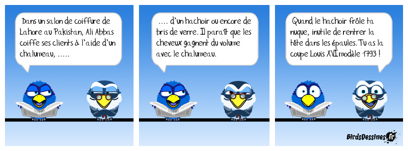Case 1:Bird 1: Dans un salon de coiffure de Lahore au Pakistan, Ali Abbas coiffe ses clients à l’aide d’un chalumeau, ..... | Case 2: Bird 1: .... d’un hachoir ou encore de bris de verre. Il paraït que les cheveux gagnent du volume avec le chalumeau. | Case 3: Bird 1: Quand le hachoir frôle ta nuque, inutile de rentrer la tête dans les épaules.Tu as la coupe Louis XVI modèle 1793 !