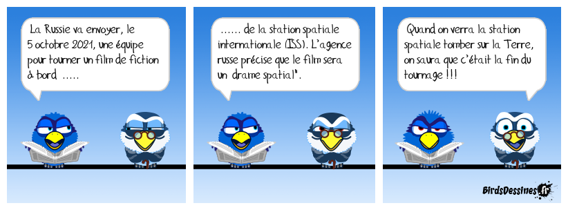 Case 1:Bird 1: La Russie va envoyer, le 5 octobre 2021, une équipe pour tourner un film de fiction à bord ..... | Case 2: Bird 1: ...... de la station spatiale internationale (ISS). L’agence russe précise que le film sera un drame spatial". | Case 3: Bird 1: Quand on verra la station spatiale tomber sur la Terre, on saura que c’était la fin du tournage !!!