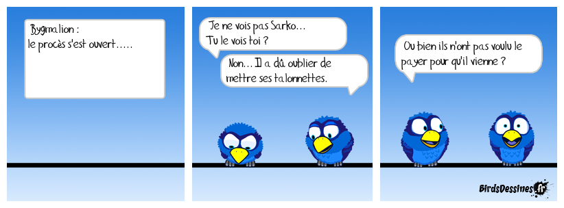 Case 1:Bird 1: Bygmalion : le procès s'est ouvert..... | Case 2: Bird 1: Je ne vois pas Sarko... Tu le vois toi ? Bird 2: Non... Il a dû oublier de mettre ses talonnettes. | Case 3: Bird 1: Ou bien ils n'ont pas voulu le payer pour qu'il vienne ?