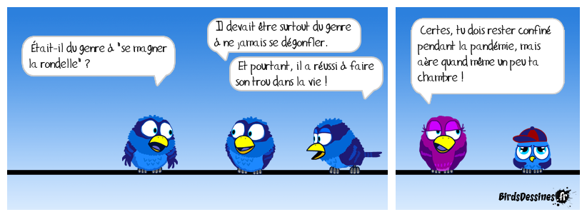 Case 1:Bird 1: Ètait-il du genre à "se magner la rondelle" ? | Case 2: Bird 1: Il devait être surtout du genre à ne jamais se dégonfler. Bird 2: Et pourtant, il a réussi à faire son trou dans la vie ! | Case 3: Bird 1: Certes, tu dois rester confiné pendant la pandémie, mais aère quand même un peu ta chambre ! Bird 2: