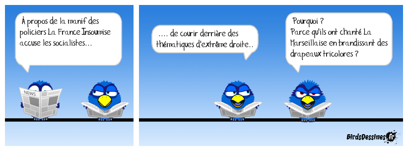 Case 1:Bird 1: À propos de la manif des policiers La France Insoumise accuse les socialistes... | Case 2: Bird 1: .... de courir derrière des thématiques d'extrême droite.. | Case 3: Bird 1: Pourquoi ? Parce qu'ils ont chanté La Marseillaise en brandissant des drapeaux tricolores ?