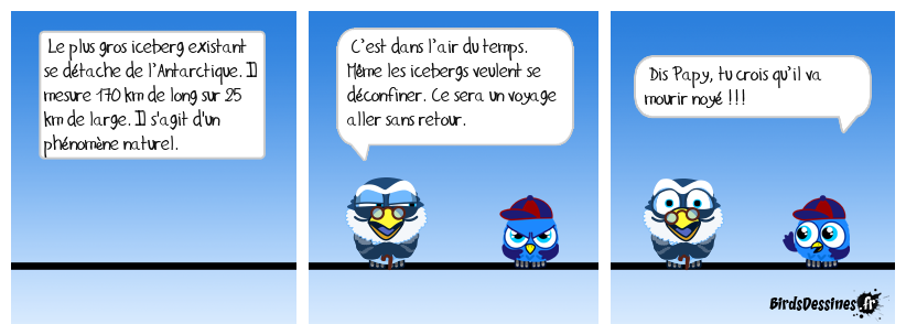 Case 1:Bird 1: Le plus gros iceberg existant se détache de l’Antarctique. Il mesure 170 km de long sur 25 km de large. Il s'agit d'un phénomène naturel. | Case 2: Bird 1: C’est dans l’air du temps. Même les icebergs veulent se déconfiner. Ce sera un voyage aller sans retour. | Case 3: Bird 1: Dis Papy, tu crois qu’il va mourir noyé !!!