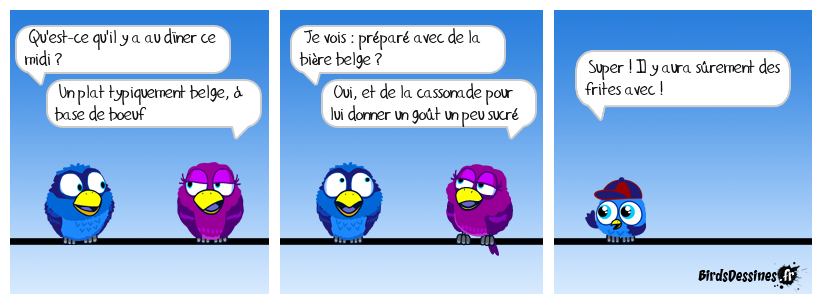 Case 1:Bird 1: Qu'est-ce qu'il y a au dîner ce midi ?Bird 2: Un plat typiquement belge, à base de boeuf | Case 2: Bird 1: Je vois : préparé avec de la bière belge ? Bird 2: Oui, et de la cassonade pour lui donner un goût un peu sucré | Case 3: Bird 1: Super ! Il y aura sûrement des frites avec ! Bird 2: Miam !