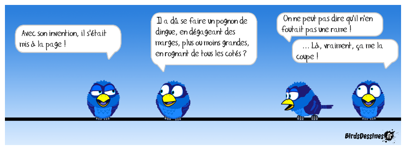 Case 1:Bird 1: Avec son invention, il s'était mis à la page ! | Case 2: Bird 1: Il a dû se faire un pognon de dingue, en dégageant des marges, plus ou moins grandes, en rognant de tous les cotés ? | Case 3: Bird 1: On ne peut pas dire qu'il n'en foutait pas une rame ! Bird 2: ... Là, vraiment, ça me la coupe !