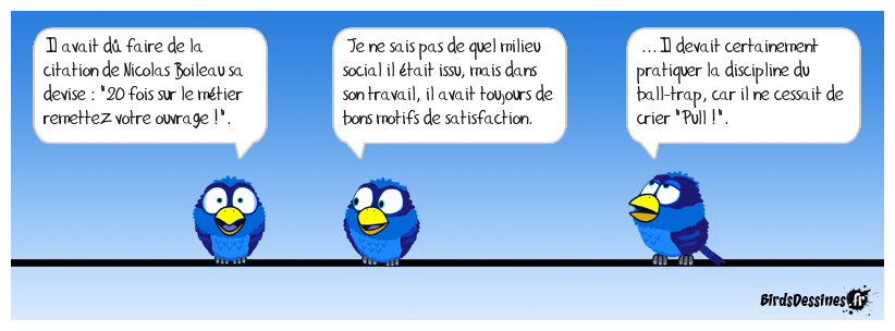 Case 1:Bird 1: Il avait dû faire de la citation de Nicolas Boileau sa devise : "20 fois sur le métier remettez votre ouvrage !". | Case 2: Bird 1: Je ne sais pas de quel milieu social il était issu, mais dans son travail, il avait toujours de bons motifs de satisfaction. | Case 3: Bird 1: ... Il devait certainement pratiquer la discipline du ball-trap, car il ne cessait de crier "Pull !".