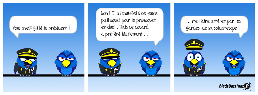 Case 1:Bird 1: Vous avez giflé le président ! | Case 2: Bird 1: Non ! J' ai souffleté ce jeune paltoquet pour le provoquer en duel . Mais ce couard a préféré lâchement ... | Case 3: Bird 1: ... me faire arrêter par les gardes de sa soldatesque !