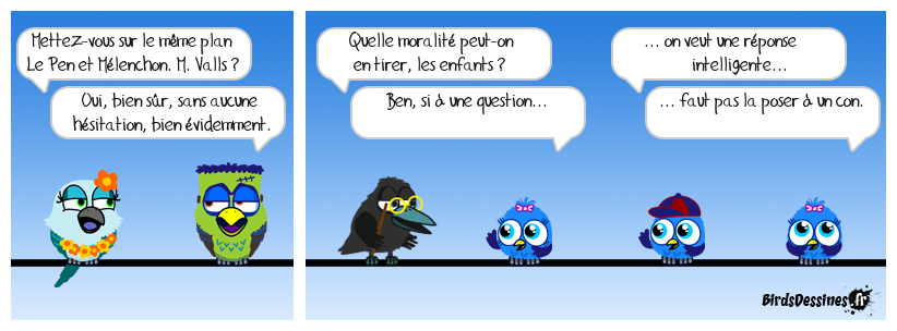 Case 1:Bird 1: Mettez-vous sur le même plan Le Pen et Mélenchon. M. Valls ?Bird 2: Oui, bien sûr, sans aucune hésitation, bien évidemment. | Case 2: Bird 1: Quelle moralité peut-on en tirer, les enfants ? Bird 2: Ben, si à une question... | Case 3: Bird 1: ... on veut une réponse intelligente... Bird 2: ... faut pas la poser à un con.