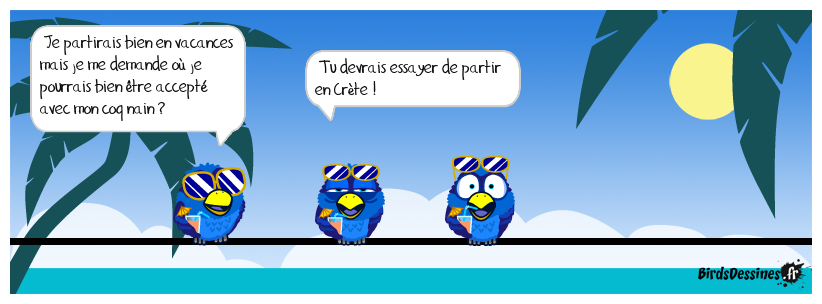 Case 1:Bird 1: Je partirais bien en vacances mais je me demande où je pourrais bien être accepté avec mon coq nain ? | Case 2: Bird 1: Tu devrais essayer de partir en Crète ! | Case 3: