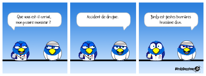 Case 1:Bird 1: Que vous est-il arrivé, mon pauvre monsieur ? | Case 2: Bird 1: Accident de drague. | Case 3: Bird 1: Birdy est gestes barrières troisième dan.