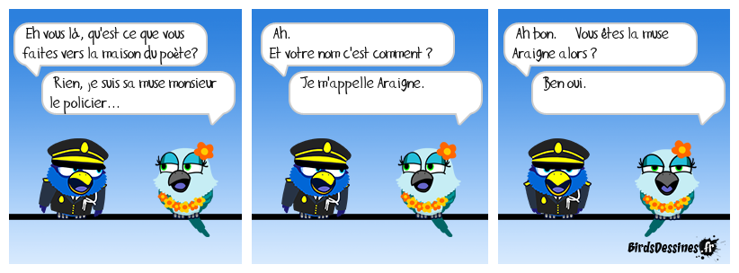 Case 1:Bird 1: Eh vous là, qu'est ce que vous faites vers la maison du poète? Bird 2: Rien, je suis sa muse monsieur le policier... | Case 2: Bird 1: Ah. Et votre nom c'est comment ? Bird 2: Je m'appelle Araigne. | Case 3: Bird 1: Ah bon. Vous êtes la muse Araigne alors ? Bird 2: Ben oui.