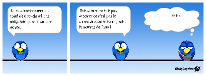 Case 1:Bird 1: La vaccination contre la covid n'est soi-disant pas obligatoire pour le quidam moyen. | Case 2: Bird 1: Mais si tu ne te fais pas vacciner ce n'est pas le coronavirus qui te tuera, juste tu mourras de faim ! | Case 3: Bird 1: Et toc !