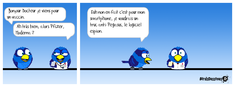 Case 1:Bird 1: Bonjour Docteur je viens pour un vaccin.Bird 2: Ah très bien, alors Pfizer, Moderna ? | Case 2: Bird 1: Euh non en fait c'est pour mon smartphone, je voudrais un truc anti-Pegasus, le logiciel espion. | Case 3: