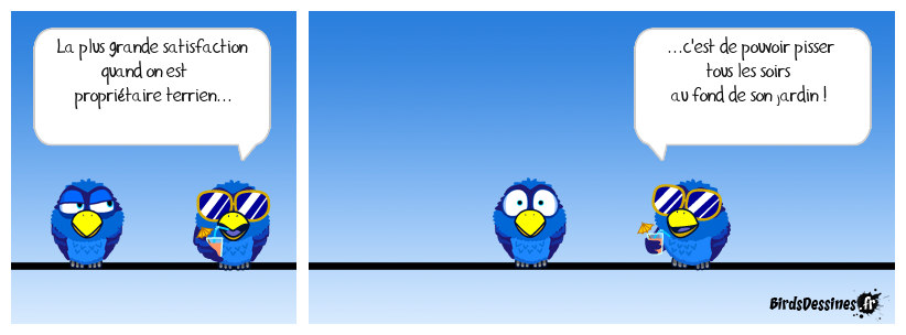 Case 1:Bird 1: La plus grande satisfaction quand on est propriétaire terrien... | Case 2: | Case 3: Bird 1: ...c'est de pouvoir pisser tous les soirs au fond de son jardin !