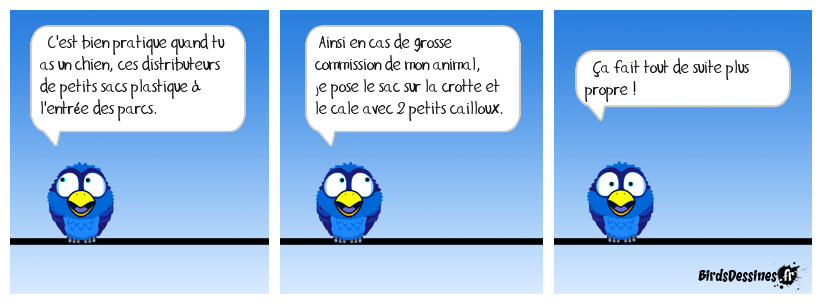 Case 1:Bird 1: C'est bien pratique quand tu as un chien, ces distributeurs de petits sacs plastique à l'entrée des parcs. | Case 2: Bird 1: Ainsi en cas de grosse commission de mon animal, je pose le sac sur la crotte et le cale avec 2 petits cailloux. | Case 3: Bird 1: Ça fait tout de suite plus propre !