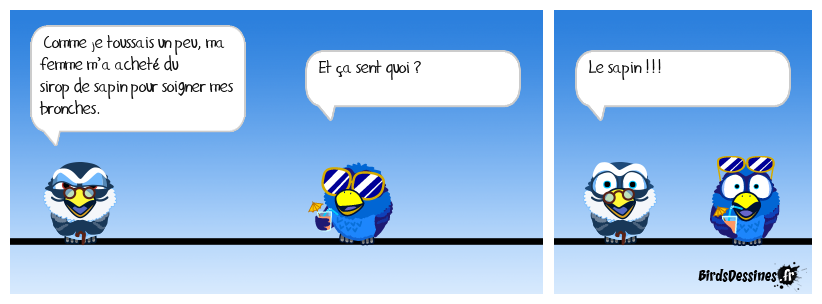 Case 1:Bird 1: Comme je toussais un peu, ma femme m’a acheté du sirop de sapin pour soigner mes bronches. | Case 2: Bird 1: Et ça sent quoi ? | Case 3: Bird 1: Le sapin !!!