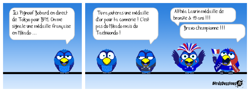 Case 1:Bird 1: Ici Pignouf Bobard en direct de Tokyo pour BFM. On me signale une médaille française en Mikado ... | Case 2: Bird 1: Tu rajouteras une médaille d'or pour ta connerie ! C'est pas du Mikado mais du Taekwondo ! | Case 3: Bird 1: Althéa Laurin médaille de bronze à 19 ans !!! Bird 2: Bravo championne !!!
