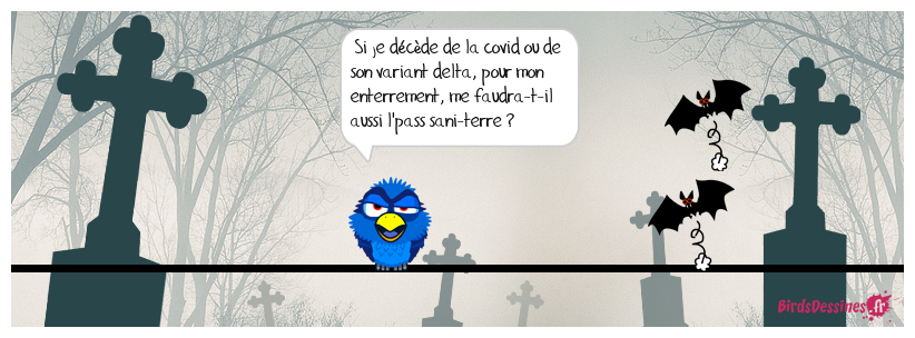 Case 1: | Case 2: Bird 1: Si je décède de la covid ou de son variant delta, pour mon enterrement, me faudra-t-il aussi l'pass sani-terre ? | Case 3:
