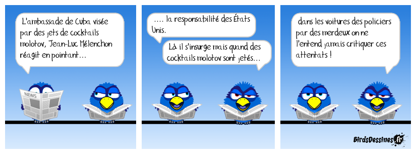 Case 1:Bird 1: L'ambassade de Cuba visée par des jets de cocktails molotov, Jean-Luc Mélenchon réagit en pointant... | Case 2: Bird 1: .... la responsabilité des Ètats Unis. Bird 2: Là il s'insurge mais quand des cocktails molotov sont jetés... | Case 3: Bird 1: dans les voitures des policiers par des merdeux on ne l'entend jamais critiquer ces attentats !