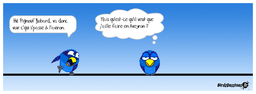 Case 1:Bird 1: Hé Pignouf Bobard, va donc voir c'qui s'passe à l'aviron. | Case 2: Bird 1: Mais qu'est-ce qu'il veut que j'aille faire en Aveyron ? | Case 3: