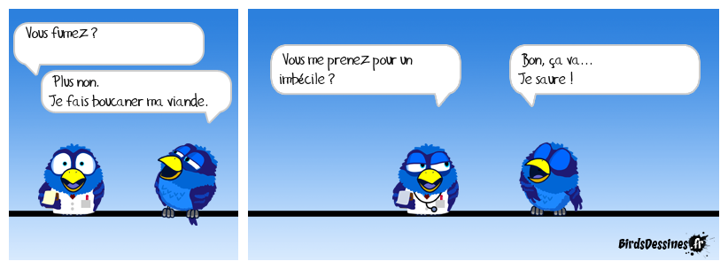 Case 1:Bird 1: Vous fumez ? Bird 2: Plus non. Je fais boucaner ma viande. | Case 2: Bird 1: Vous me prenez pour un imbécile ? | Case 3: Bird 1: Bon, ça va... Je saure !