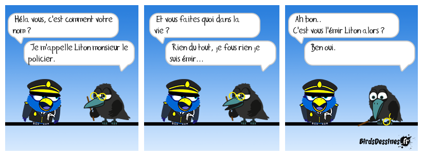 Case 1:Bird 1: Héla vous, c'est comment votre nom ? Bird 2: Je m'appelle Liton monsieur le policier. | Case 2: Bird 1: Et vous faites quoi dans la vie ? Bird 2: Rien du tout, je fous rien je suis émir... | Case 3: Bird 1: Ah bon.. C'est vous l'émir Liton alors ? Bird 2: Ben oui.
