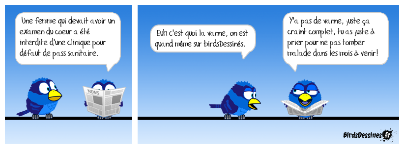 Case 1:Bird 1: Une femme qui devait avoir un examen du coeur a été interdite d'une clinique pour défaut de pass sanitaire. | Case 2: Bird 1: Euh c'est quoi la vanne, on est quand même sur birdsDessinés. | Case 3: Bird 1: Y'a pas de vanne, juste ça craint complet, tu as juste à prier pour ne pas tomber malade dans les mois à venir!