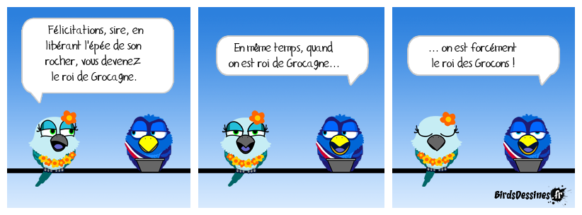 Case 1:Bird 1: Félicitations, sire, en libérant l'épée de son rocher, vous devenez le roi de Grocagne. | Case 2: Bird 1: En même temps, quand on est roi de Grocagne... | Case 3: Bird 1: ... on est forcément le roi des Grocons !
