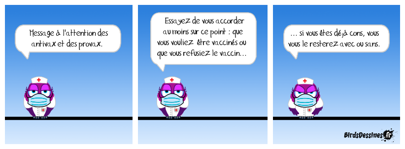 Case 1:Bird 1: Message à l'attention des antivax et des provax. | Case 2: Bird 1: Essayez de vous accorder au moins sur ce point : que vous vouliez être vaccinés ou que vous refusiez le vaccin... | Case 3: Bird 1: ... si vous êtes déjà cons, vous vous le resterez avec ou sans.