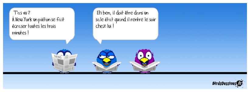 Case 1:Bird 1: T'as vu ? À New York un piéton se fait écraser toutes les trois minutes ! | Case 2: Bird 1: Eh ben, il doit être dans un sale état quand il rentre le soir chez lui ! | Case 3: