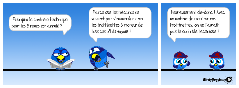 Case 1:Bird 1: Pourquoi le contrôle technique pour les 2 roues est annulé ? | Case 2: Bird 1: Parce que les mécanos ne veulent pas s'emmerder avec les trottinettes à moteur de tous ces p'tits voyous ! | Case 3: Bird 1: Heureusement dis-donc ! Avec un moteur de mob' sur nos trottinettes, on ne l'aurait pas le contrôle technique !