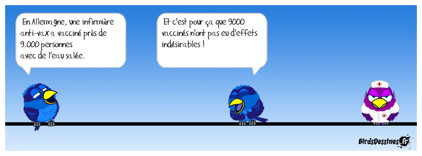 Case 1:Bird 1: En Allemagne, une infirmière anti-vax a vacciné près de 9.000 personnes avec de l'eau salée. | Case 2: Bird 1: Et c'est pour ça que 9000 vaccinés n'ont pas eu d'effets indésirables ! | Case 3: