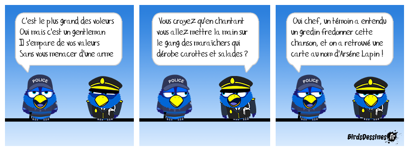 Case 1:Bird 1: C'est le plus grand des voleurs Oui mais c'est un gentleman Il s'empare de vos valeurs Sans vous menacer d'une arme | Case 2: Bird 1: Vous croyez qu'en chantant vous allez mettre la main sur le gang des maraîchers qui dérobe carottes et salades ? | Case 3: Bird 1: Oui chef, un témoin a entendu un gredin fredonner cette chanson, et on a retrouvé une carte au nom d'Arséne Lapin !