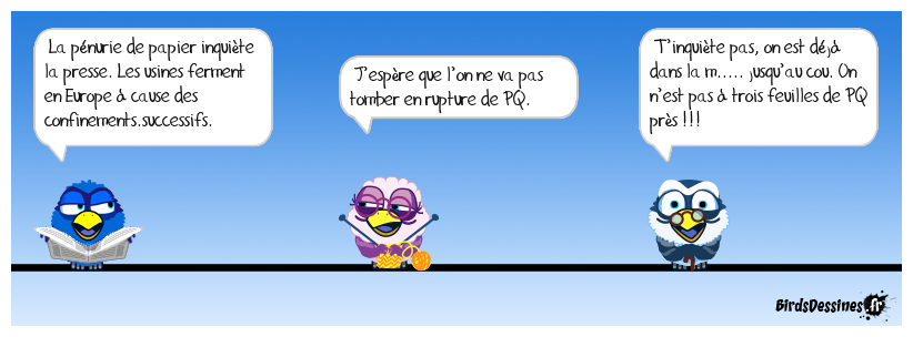 Case 1:Bird 1: La pénurie de papier inquiète la presse. Les usines ferment en Europe à cause des confinements.successifs. | Case 2: Bird 1: J’espère que l’on ne va pas tomber en rupture de PQ. | Case 3: Bird 1: T’inquiète pas, on est déjà dans la m..... jusqu’au cou. On n’est pas à trois feuilles de PQ près !!!