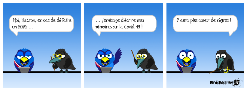 Case 1:Bird 1: Moi, Macron, en cas de défaite en 2022 ... | Case 2: Bird 1: ... j'envisage d'écrire mes mémoires sur la Covid-19 ! | Case 3: Bird 1: Y aura plus assez de nègres !