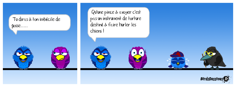 Case 1:Bird 1: Tu diras à ton imbécile de gosse..... | Case 2: Bird 1: Qu'une pince à avoyer c'est pas un instrument de torture destiné à faire hurler les chiens ! | Case 3: