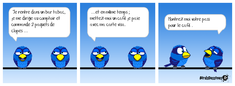Case 1:Bird 1: Je rentre dans un bar tabac, je me dirige au comptoir et commande 2 paquets de clopes ... | Case 2: Bird 1: ...et en même temps ; mettez-moi un café je paie avec ma carte visa. | Case 3: Bird 1: Montrez moi votre pass pour le café .
