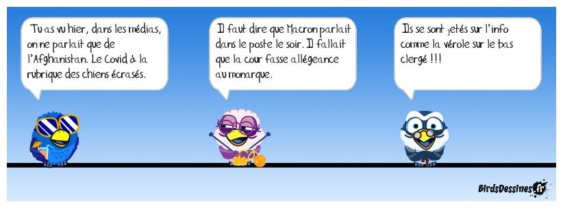 Case 1:Bird 1: Tu as vu hier, dans les médias, on ne parlait que de l’Afghanistan. Le Covid à la rubrique des chiens écrasés. | Case 2: Bird 1: Il faut dire que Macron parlait dans le poste le soir. Il fallait que la cour fasse allégeance au monarque. | Case 3: Bird 1: Ils se sont jetés sur l’info comme la vérole sur le bas clergé !!!