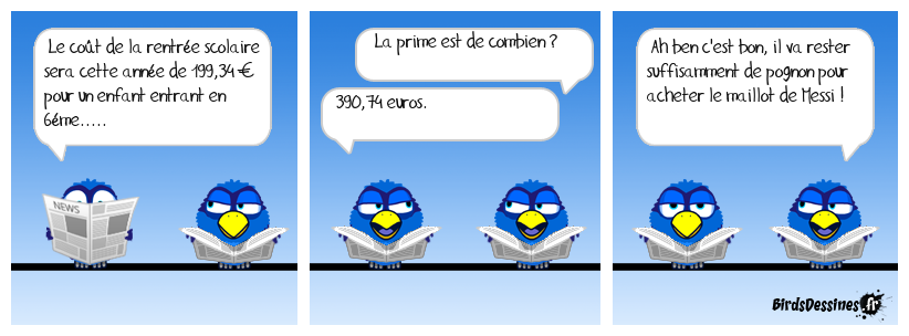 Case 1:Bird 1: Le coût de la rentrée scolaire sera cette année de 199,34 € pour un enfant entrant en 6éme..... | Case 2: Bird 1: La prime est de combien ? Bird 2: 390,74 euros. | Case 3: Bird 1: Ah ben c'est bon, il va rester suffisamment de pognon pour acheter le maillot de Messi !