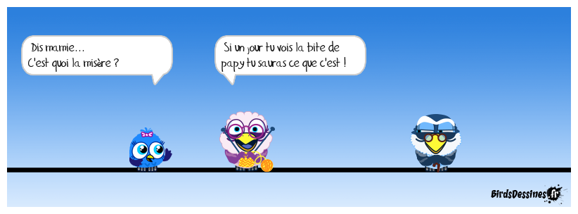 Case 1:Bird 1: Dis mamie... C'est quoi la misère ? | Case 2: Bird 1: Si un jour tu vois la bite de papy tu sauras ce que c'est ! | Case 3: