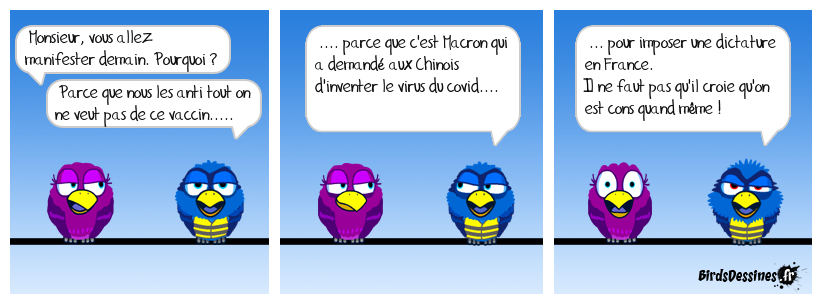 Case 1:Bird 1: Monsieur, vous allez manifester demain. Pourquoi ? Bird 2: Parce que nous les anti tout on ne veut pas de ce vaccin..... | Case 2: Bird 1: .... parce que c'est Macron qui a demandé aux Chinois d'inventer le virus du covid.... | Case 3: Bird 1: ... pour imposer une dictature en France. Il ne faut pas qu'il croie qu'on est cons quand même !