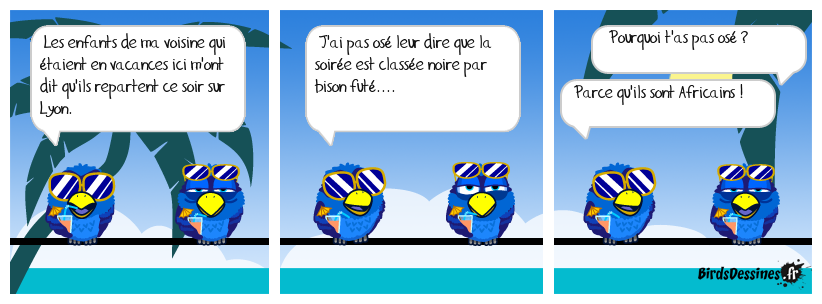 Case 1:Bird 1: Les enfants de ma voisine qui étaient en vacances ici m'ont dit qu'ils repartent ce soir sur Lyon. | Case 2: Bird 1: J'ai pas osé leur dire que la soirée est classée noire par bison futé.... | Case 3: Bird 1: Pourquoi t'as pas osé ? Bird 2: Parce qu'ils sont Africains !