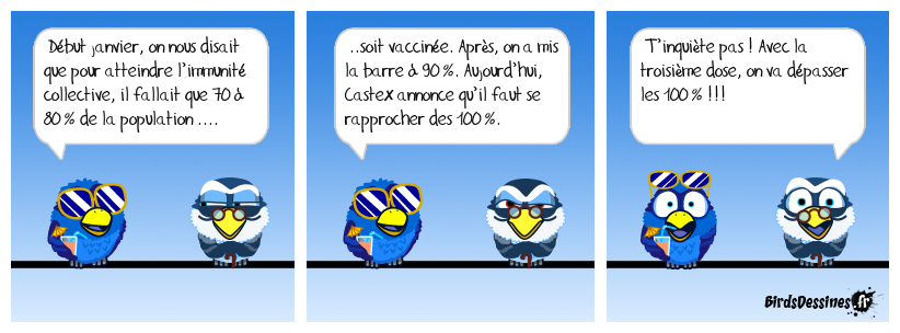 Case 1:Bird 1: Début janvier, on nous disait que pour atteindre l’immunité collective, il fallait que 70 à 80 % de la population .... | Case 2: Bird 1: ..soit vaccinée. Après, on a mis la barre à 90 %. Aujourd’hui, Castex annonce qu’il faut se rapprocher des 100 %. | Case 3: Bird 1: T’inquiète pas ! Avec la troisième dose, on va dépasser les 100 % !!!
