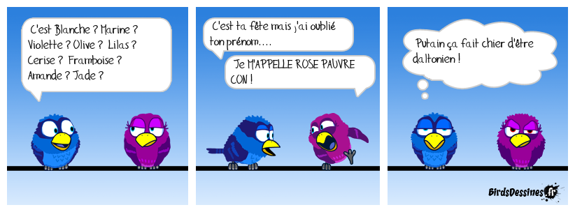Case 1:Bird 1: C'est Blanche ? Marine ? Violette ? Olive ? Lilas ? Cerise ? Framboise ? Amande ? Jade ? | Case 2: Bird 1: C'est ta fête mais j'ai oublié ton prénom.... Bird 2: Je M'APPELLE ROSE PAUVRE CON ! | Case 3: Bird 1: Putain ça fait chier d'être daltonien !