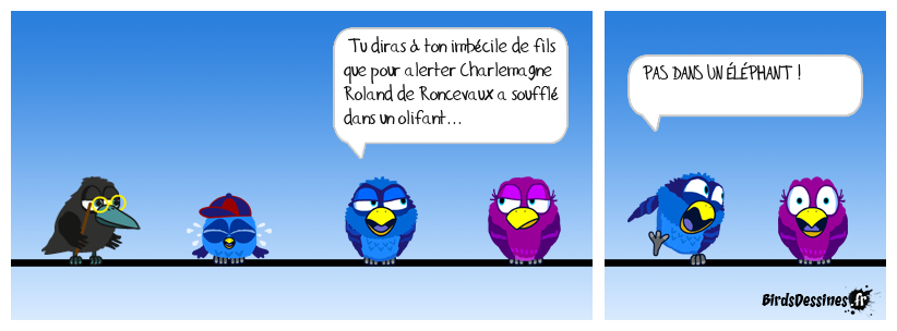 Case 1: | Case 2: Bird 1: Tu diras à ton imbécile de fils que pour alerter Charlemagne Roland de Roncevaux a soufflé dans un olifant... | Case 3: Bird 1: PAS DANS UN ÈLÈPHANT !