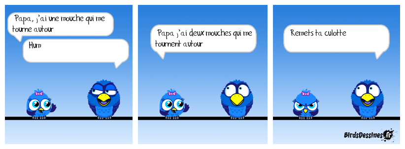 Case 1:Bird 1: Papa, j’ai une mouche qui me tourne autourBird 2: Hum | Case 2: Bird 1: Papa j’ai deux mouches qui me tournent autour | Case 3: Bird 1: Remets ta culotte