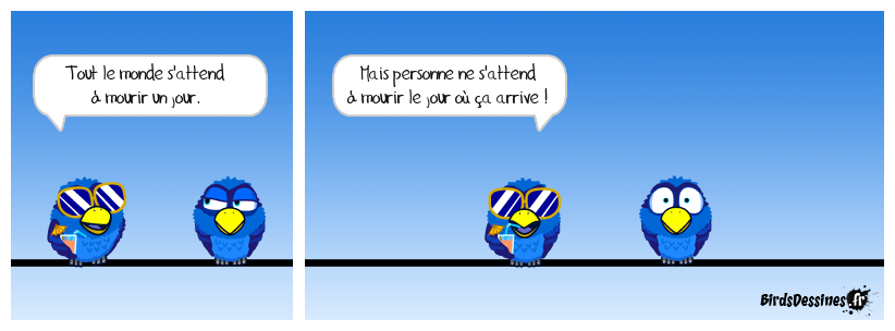 Case 1:Bird 1: Tout le monde s'attend à mourir un jour. | Case 2: Bird 1: Mais personne ne s'attend à mourir le jour où ça arrive ! | Case 3: