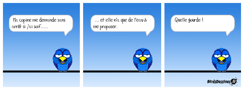 Case 1:Bird 1: Ma copine me demande sans arrêt si j'ai soif..... | Case 2: Bird 1: ... et elle n'a que de l'eau à me proposer. | Case 3: Bird 1: Quelle gourde !
