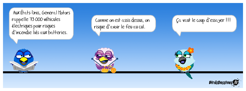Case 1:Bird 1: Aux Ètats-Unis, General Motors rappelle 73 000 véhicules électriques pour risques d’incendie liés aux batteries. | Case 2: Bird 1: Comme on est assis dessus, on risque d’avoir le feu au cul. | Case 3: Bird 1: Ça vaut le coup d’essayer !!!